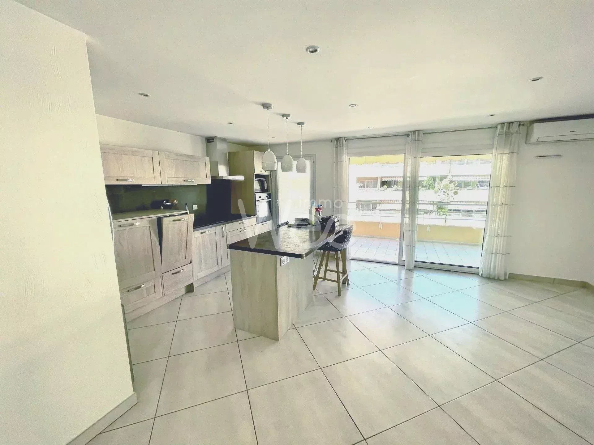 Ref. 86516569 - Antibes Les Pins, dans une résidence standing beau 3 pièces traversant de 63 m² en étage. En parfait état et refait à neuf il y a peu, celui-ci bénéficie d'un confort moderne : séjour climatisé avec cuisine américaine de 30m2 ouvrant sur une grand terrasse ouest de 12 m², volets électriques, 2 belles chambres, une salle d'eau avec douche à l'italienne, toilettes suspendues, etc. Une cave et un parking privatif en sous-sol complètent le confort de ce bel appartement. Proximité des plages, commerces et commodités.
